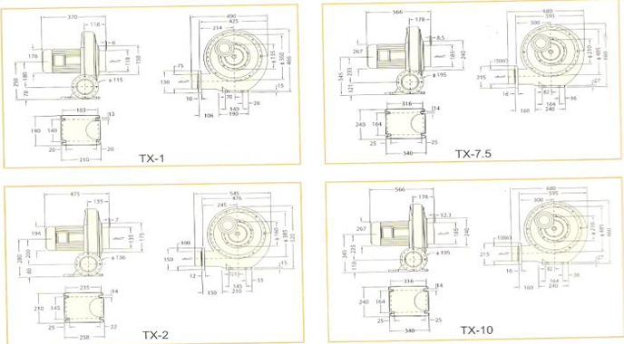 TX鼓风机特点1:小型重量轻,高风压。前侧式叶片设计,体积小,质量轻且较有高压力之产生。