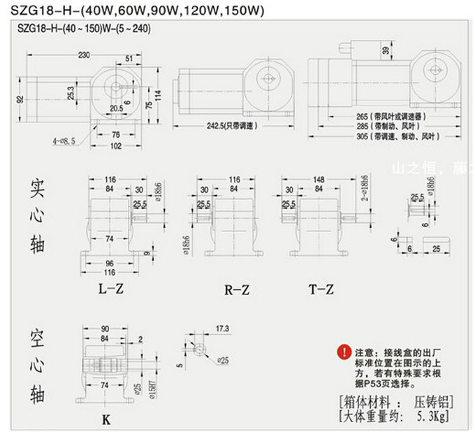 直交轴小型减速机SZG-H(实心右出轴)山藤SEND直交轴减速机功率:25~120W减速比:1/5~1/240轴布置:直交轴特点:1.高效率与低噪音 山藤SEND减速机采用准双曲面齿轮设计,在性能上兼顾有斜齿轮的低噪音性和伞齿轮的高效率特点,是一款不可多得的高效且低噪的减速机。 蜗轮蜗杆减速机相比,双曲面齿轮的滑动摩擦较小,因此其传动效率比蜗轮蜗杆高;最高可达98%的传动效率。另一方面,螺旋伞齿轮的齿轮啮合一般在2齿左右,而山藤SEND准双曲面齿轮拥有越2.5齿的啮合,因此其运转时噪音比伞齿轮更低。2.与蜗轮蜗杆齿轮箱相比,山藤SEND的使用寿命更长 山藤SEND的齿...