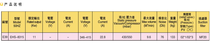 双段鼓风机EHS8315(旋涡气泵)是一种吹气或吸气两用的通用气源。风机,高压风机,鼓风机,升鸿高压风机,瑞昶风机,旋涡气泵,吸风泵,吸料风机,真空泵,侧流风机它主要用于:切纸机,燃烧降氧机、卷烟滤嘴成型机、电镀槽液搅拌、雾化乾燥机、水处理爆气、水产、丝网印刷机、照相制版机、注塑机自动上料烘干机、液体灌装机、粉末灌装机、电焊设备、电影机械、纸张运送、清洁用途、空气除尖、干瓶、气体传送、送料、收集等方面 功率:0.18KW 0.4KW 0.75KW 1.1KW 1.75KW 2.2KW 3.7KW 4KW 5.5KW 7.5KW 9KW 13KW 20KW EHS-129 EHS-229 EHS-329 EHS-339 EHS-429 EHS-439 EHS-529 EHS-629 EHS-639 EHS-729 EHS-829 EHS-919 EHS-929 EHS-939 EHS-4337 EHS-4346 EHS-6346 EHS-6355 EHS-6375 EHS-6455 EHS-6475 EHS-8310 EHS-8315 EHS-8320 EHS-8410 EHS-8415 EHS-9320 EHS-9325 EHS-9420 EHS-9425 风压:50mbar~650mbar 风量:40立方/小时~1134立方/小时(为方便选用不同规格,单段式/双段式均有货提供) 频率:50Hz/60Hz 电压:110V~615V(万国电压,各国均可使用。如需特殊电压,可按要求定做) 释压阀 RV-01 RV-02(配套使用) 过滤器 MF8 MF10 MF12 MF16 MF-20 MF-32 本公司有专业的相关技术工程师,欢迎广大客户来电来函咨询相关业务--风机,高压风机,鼓风机,升鸿高压风机,瑞昶风机,旋涡气泵,吸风泵,吸料风机,真空泵,侧流风机。